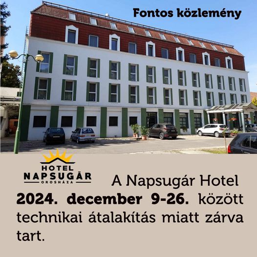 A Napsugár Hotel 2024. december 9. és december 26. között technikai átalakítás miatt zárva tart.